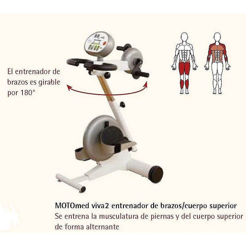 إلى جانب كونه جهاز تدريب للساق، يتوفر جهاز MOTOmed viva2 أيضًا كجهاز تدريب للساق والذراع/الجزء العلوي من الجسم. يُمكن تدوير جهاز تدريب الذراع/الجزء العلوي من الجسم MOTOmed داخل وخارج منطقة التدريب. يُقوّي تدريب الذراع/الجزء العلوي من الجسم عضلات الذراع والجزء العلوي من الجسم والكتف، كما يُقوّي عضلات التنفس المساعدة.